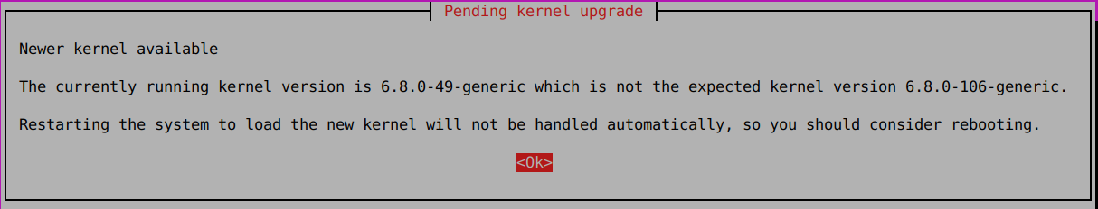 This screenshot shows that I am running an old version of the kernel, and need to reboot.